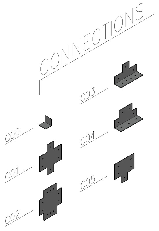 The connection system between the wooden elements of the structure includes a threaded dowel inserted in a preformed hole in the wooden structure and clamping two steel plates by means of a bolt coupled to a washer (see Figure 5). The connections are then localized at the extremities of the modules and are strongly standardized. This is a particularly effective solution that is able to ensure a quick and easy assembly/disassembly of building components without the risk of damaging the different components after repeated assembly and disassembly operations. In Figure 5, some of the most important connections of the system are shown. Every connection between two or more elements is realized by two external steel plates designed specifically for each specific position and are strongly standardized with a very simple geometry. For example, the connection plate C00 in the figure represents the plates connecting, at the corners, the main elements of the frames F01 and F02; instead, plates C01, C02, and C05 are typical of the connections between modules, and finally, C04 and C03 are plates designed for the connection between vertical modules and basement elements.