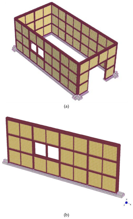 Views of finite element model of the prototype building investigated. (a) Whole 3D model and (b) lateral side of the model.