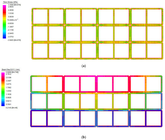 Contour of (a) normal stress and (b) vertical displacements for the structural elements of the modules.