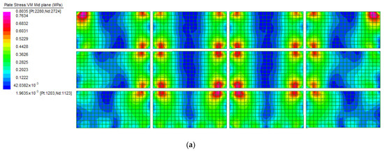 The results extracted from the envelope of the static combinations at the ULS provide the stress contour, shown in Figure 7, for the elements of the different frames. The values reported are compatible with the design strength of the materials selected in the design phase. In the analysis of the vertical displacement values assessed by the model (see Figure 7b), the results show that they are compatible with non-structural elements and systems that can be clamped or anchored on the structure. Similar conclusions can be obtained by the analysis of the results of stress and displacements measured on the OSB panels of the modules (see Figure 8). Even in this case, they are compatible with the capacity of the materials adopted, and as expected, the stress peaks are localized in correspondence with the connections.