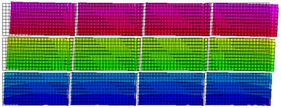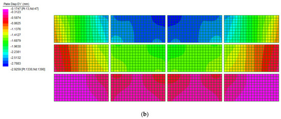 The analysis of the natural frequencies and the associated natural vibration modes suggests that the dynamic behaviour of the system proposed in this paper is similar to the dynamic behaviour of a timber wall system [28]. In fact, the high in-plane stiffness of the modules associated with the low slenderness of the building provides a typical shear-based horizontal deflection. Moreover, because the structure is substantially symmetrical and is characterized by one story, it is sufficient to consider only the first translational mode in each direction to activate a consistent percentage of the vibrating mass of the building. In the present case, the two first modes in the two main orthogonal directions correspond to frequencies of around 4.9 Hz and 5.5 Hz, respectively, and activate more than 90% of the total vibrating mass of the building. Just to provide the evidence of this peculiarity, in Figure 9, the horizontal deflection of the building from a lateral view is shown. This is evident as each horizontal lane of panels deformed and slid relatively with respect to the lane immediately below. The relative horizontal displacements between one panel lane and the lane below, in this shear-type deformed shape, is mainly governed by the membrane stiffness of the connection between the panels.