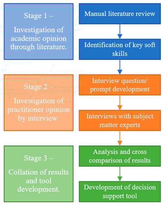 This research adopts a mixed philosophical design (using interpretivism, postpositivism and grounded theory (cf. Bayramova et al. []) and abductive reasoning to examine industry subject matter experts’ (SMEs’) perceptions of soft skills required on PLI projects, the purpose being to identify specific soft skills for incorporation into a conceptual “decision support tool” which allows teams to gain theoretical insight into potential avenues for candidate recruitment or optimal personnel selection based on the skills required for a task [,]. Specifically, interpretivism provided a contextual view of soft skills within PLI projects, postpositivism analysed the results from semi-structured interviews, and grounded theory provided the knowledge foundations for developing the decision support tool.