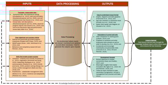 Key comments were synthesised and correlated with the literature to extrapolate the key criteria for the inputs and outputs required to make a tool that informs decisions around training, growth and development (refer to Figure 2). The graphic is structured in swim lanes and has four key segments—inputs, outputs, data processing and feeding lessons learned into a knowledge feedback loop.