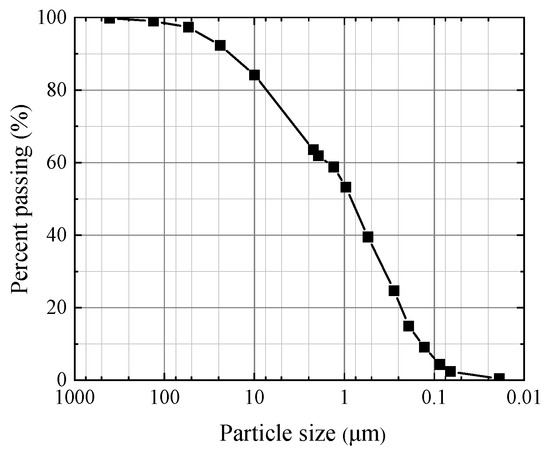 The particle grading of the loess selected in this paper is determined by the screening method (0.075–0.5 mm particle size) and the density meter method (less than 0.075 mm particle size), as shown in Figure 2.