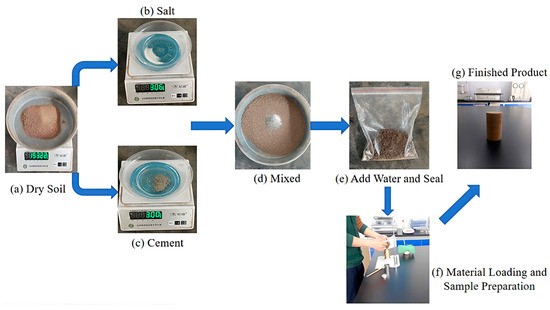 Sample preparation process diagram: (a) dry soil; (b) salt; (c) cement; (d) mixed; (e) add water and seal; (f) material loading and sample preparation; (g) finished product.