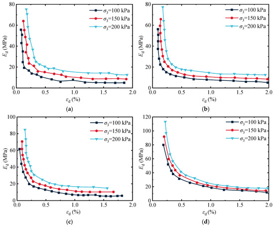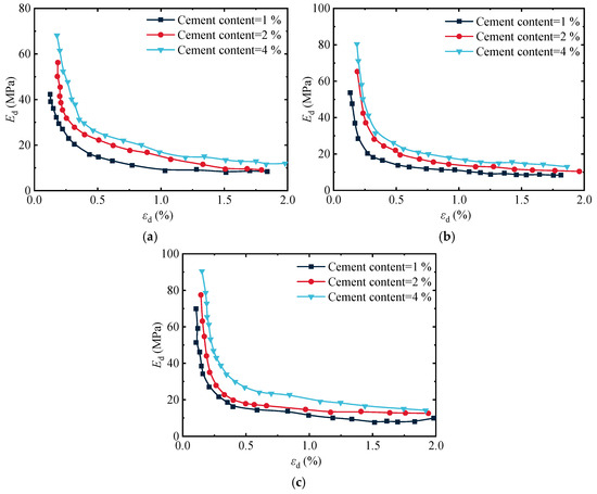 The impact of cement content on the DM-E of artificial structural loess: (a) σ3 = 100 kPa; (b) σ3 = 150 kPa; (c) σ3 = 200 kPa.