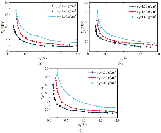Influence of dry density on the DM-E of artificial structural loess: (a) σ3 = 100 kPa; (b) σ3 = 150 kPa; (c) σ3 = 200 kPa.