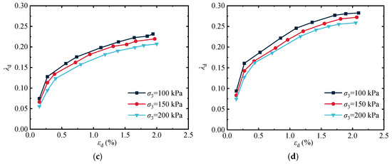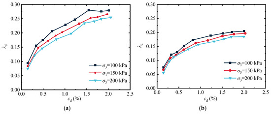 Figure 8 shows the correlation between damping fraction and dynamic strain at different dry densities with a cement content of 2% under CP of 100, 150, and 200 kPa. It can be observed that the damping ratio of soil increases rapidly with the development of dynamic strain. When the dynamic strain εd > 2%, the damping ratio stabilizes to a specific value, reaching the maximum damping ratio. When the dry density is constant, the damping fraction of artificial structural loess increases with the increasing dynamic strain and decreases with the rising CP. When the CP is continuous, the damping ratio will slowly increase with the increase in the dry density. This phenomenon occurs because the consolidation CP exerts axial tension on the soil, restricting the relative motion between particles and weakening the energy dissipation mechanism. Under higher CP, the overall structure of the soil becomes more stable, local deformation is suppressed, and energy is not quickly dissipated, resulting in a decrease in the damping fraction, which is in line with the conclusion of reference [20]. The number of contact points between soil particles increases as the dry density increases. Under dynamic action, the friction between particles is enhanced, allowing the soil to dissipate vibration energy more effectively.
