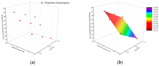 Three-dimensional surface model of artificially structured loess under different conditions: (a) 3D scatter plot of macropore ratio; (b) 3D model of macropore ratio.