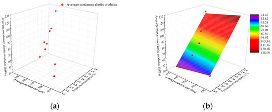 Three-dimensional surface model of artificially structured loess under different conditions: (a) 3D scatter plot of average maximum elastic modulus; (b) average maximum elastic modulus 3D model diagram.