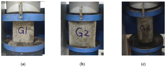 In order to determine the compressive strength of specimens, a compression test was performed after 28 days on standard concrete cubes measuring 150 mm and 100 mm, as well as on cylinders measuring 100 × 200 mm. This was executed using a force-controlled compression testing apparatus with a load capacity of 2000 kN and a rate of loading of 0.50 MPa per second, as illustrated in Figure 5.