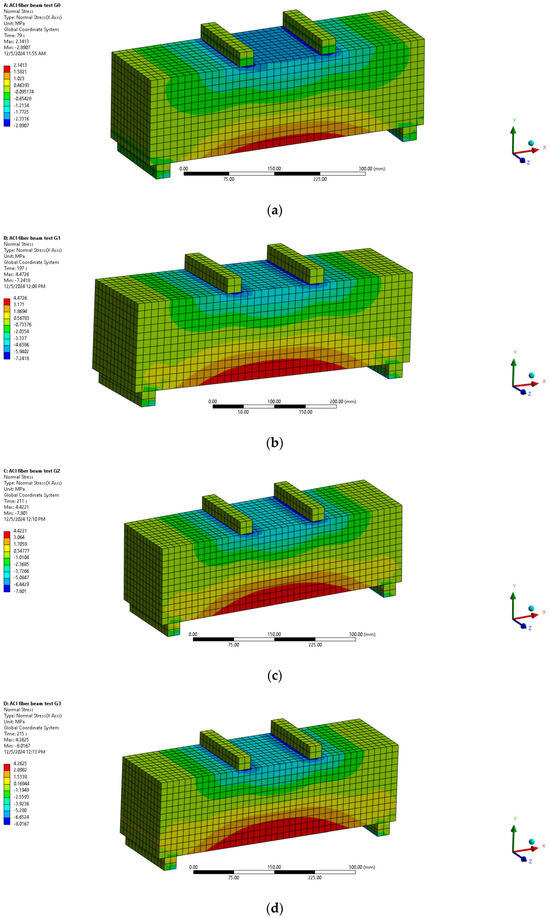 The normal stress in the X-direction at 0.75 Pu for the 3DPFCC beams. (a) G0; (b) G1-PP; (c) G2-PAC; (d) G3-ARG.