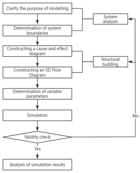 Therefore, this paper adopts a system dynamics model that can deal with complex systems with feedback loops, delays and dynamically changing characteristics, reflect more comprehensively the multifactor interactions in the system, and study long-term and cyclical problems []. The idea of applying system dynamics can be divided into the following seven steps, as shown in Figure 1.