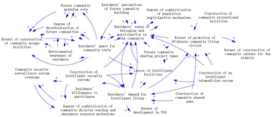 Vensim PLE x64 software was used to draw a causality diagram of the driving factors of future community building from the perspective of resident participation, as shown in Figure 2. A causal diagram consists of the variables of a system and the feedback loops formed between them []. In the causality diagram, a positive feedback relationship means that an increase in one variable causes an increase in another variable associated with it, which is indicated by a ‘+’ arrow; the opposite is a negative feedback relationship, which is indicated by a ‘−’ arrow [].