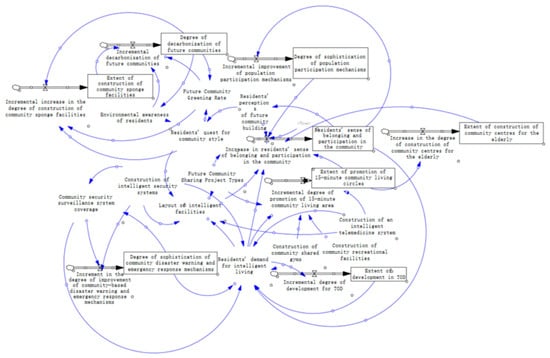 The causal loop diagram expresses the correlation and feedback process between system elements, and to further distinguish the nature of variables in the system, a system flow chart is needed to describe the process of system management and control. A flowchart is based on the causal diagram with more intuitive symbols to portray the logical relationship between the system elements to clarify the feedback mechanism and control law of the system []. Therefore, based on the above causality diagram, this paper constructs the SD flow diagram of future community building from the perspective of residents’ participation, as Figure 3 below shows.