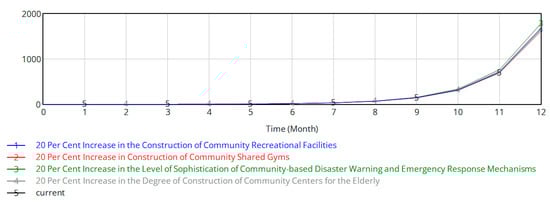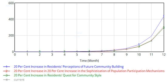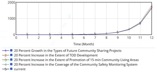 To discover the dynamics of the driving mechanism of future community building from the perspective of residents’ participation at a certain time in the future, a simulation was carried out using the Vensim PLE 10.2.1 software. In the model, INITIAL TIME = 0, FINIAL TIME = 12, TIME STEP = 1, Units for Time = Month; meanwhile, the system dynamics model is divided into five modules according to the first-level indexes, namely, humanistic module, ecological module, wisdom module, convenience module, and livability module, and different simulation schemes are designed based on each module. Based on each module, different simulation schemes are designed to analyze the effects of the drivers on residents’ participation in future community building in different stages from the time dimension by adjusting the input values of the drivers.