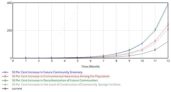 The input values of the greening rate of the future community, residents’ environmental awareness, the degree of decarbonization of the future community, and the degree of construction of sponge facilities in the future community were sequentially simulated by increasing the input values by 50% to obtain the effects of different ecological drivers on residents’ sense of participation and sense of belonging, as shown in Figure 5 and Table 8.