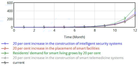 The input values of the construction of a smart security system, the arrangement of intelligent facilities, the residents’ demand for intelligent life, and the construction of an intelligent telemedicine system were simulated by increasing the input values by 20%, in turn, to obtain the effect of different smartness drivers on residents’ sense of participation and sense of belonging, as shown in Figure 6 and Table 9.