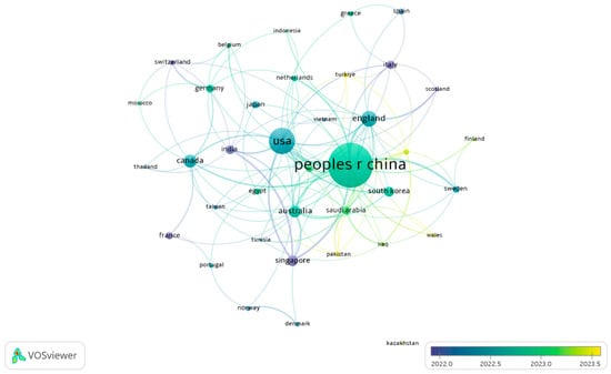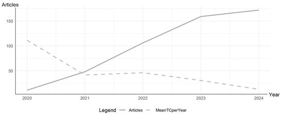 As shown in Figure 2, the pattern of average yearly citations differs from the trajectory of annual research output. Starting from 2020, the average citations per year show a notable decline. While there is a slight recovery or stabilization in 2022, the overall trend continues to decrease in subsequent years. This downward trajectory could potentially be attributed to a reduction in the visibility or impact of recent publications. Additionally, this decrease may also be influenced by factors such as the quality of the studies or a decrease in international collaborations, as previous studies have highlighted a correlation between the quantity and type of collaboration and citation impact [41,42].