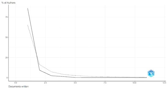 Figure 3 illustrates the correlation between the number of authors and the quantity of published documents, analyzed through the lens of Lotka’s Law. This principle in bibliometrics outlines how productivity is distributed among authors within a particular research field [43]. It states that the number of authors producing n papers is inversely proportional to n2. In other words, only a small percentage of authors are highly productive, contributing multiple publications, while the majority of authors contribute fewer publications. This results in a skewed distribution, where a significant portion of documents is authored by a small group of prolific contributors [44].