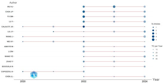 Table 3 and Figure 4 presents the results, highlighting the 15 most influential authors. Dr. Huijun Wu from Guangzhou University stands out as the leading author, with the highest number of publications as well as the top H-index, G-index, and M-index. While his articles do not have the highest total citation count, this can be attributed to his entry into the field in 2022. Older publications generally accumulate more citations over time, and many of his recent works have not yet been widely accessed by readers.