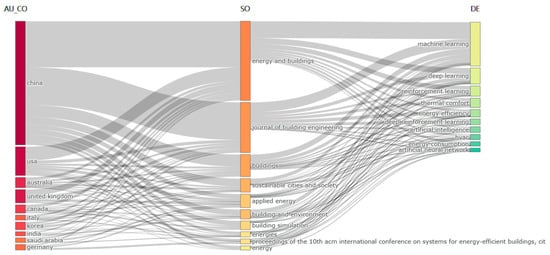 From Figure 6, it is evident that China is the most active country, closely associated with technologies such as “Machine Learning”, “Deep Learning”, and “Reinforcement Learning”, with most of its research findings published in Energy and Buildings and Journal of Building Engineering. The United States and Australia, on the other hand, have focused their research not only on topics such as “Thermal Comfort” and “Artificial Neural Network” but have also demonstrated significant potential in the field of intelligent building energy management.