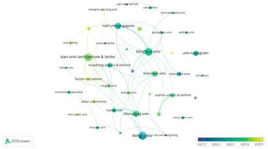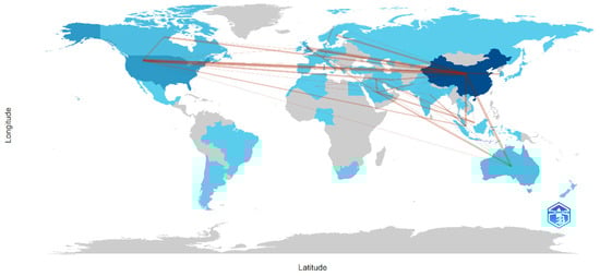 As illustrated in Figure 7, the collaboration map between countries clearly reveals the major international partnerships in the field of building energy efficiency. Among these, the frequency of collaboration is highest between China and the United States, China and Australia, as well as the United Kingdom and Australia. This highlights the central position of research teams from China, the United States, the United Kingdom, and Australia within high-frequency collaboration networks. The academic productivity based on author affiliations further underscores the depth and intensity of international cooperation. In the map, the thickness of the connecting lines represents the strength of collaboration, with thicker lines indicating closer partnerships.