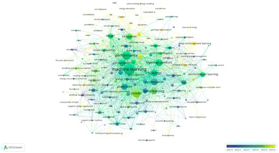Earlier research themes primarily centered on foundational topics such as “Energy Consumption” and “Energy Efficiency”. However, emerging themes in recent years, such as “Reinforcement Learning” and “HVAC”, highlight a growing emphasis on the application of intelligent and deep learning technologies in the built environment. This trend indicates a gradual shift in the field towards a more intelligent, data-driven approach to building energy efficiency.