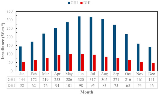 Figure 1 shows the monthly radiation throughout the year. The radiation is higher in the warmer months of the year. June shows the highest GHI of the year, with a value of 320 W·m−2, and May shows the highest DHI of 101 W·m−2. The lowest radiation is in December, with GHI and DHI values of 141 and 46 W·m−2, respectively.