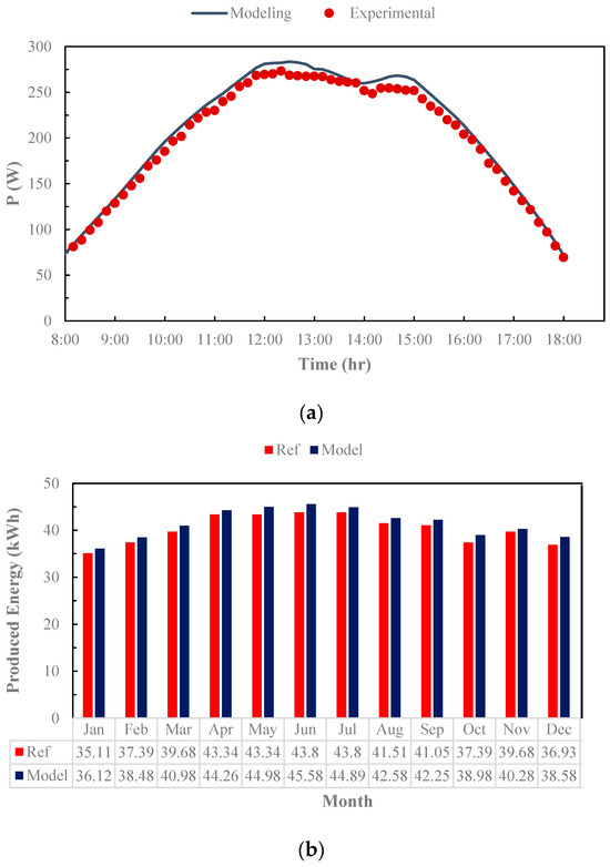 The results extracted by the two rooftop PV and BIPV power generation systems were compared using two sets of experimental data in the studies. The PV system was compared to the study of Shahvardian et al. [54]. The experimental data of this study were used for validation, and the validation results are given in Figure 2a. The photovoltaic system considered for validation is a 320 W monocrystalline panel with dimensions of 1956 × 992 mm. Additionally, the reference efficiency of this panel is 19.2%. The experimental work was carried out in July. The difference between the reference experimental data and the modeling data is 4%, which is acceptable.