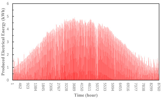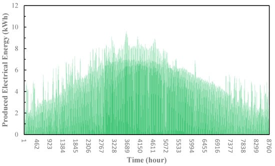 The study of Hosseinzadeh et al. [55] was also used for validation of the BIPV system. The results obtained from the validation are given in Figure 2b. The BIPV system considered for validation is located in Mashhad, Iran. In this study, a 5.2 kW system was tested, which consists of a 1 kW system and 16 polycrystalline modules. The difference between the modeling and the experimental data was 2.36%, which is acceptable. Consequently, the validation results show the correctness of the modeling.