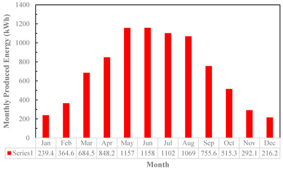 Figure 4 presents the monthly cumulative energy generation of the rooftop PV system over a year. The data indicate that the highest energy production occurs in June, reaching approximately 1157.5 kWh, while the lowest production is observed in December at 216.2 kWh. Seasonal variations in solar radiation and day length significantly influence PV output. Longer summer days and higher solar irradiance contribute to increased power generation, while winter months exhibit reduced output due to shorter days and lower irradiance angles. This information is critical for designing energy storage solutions and grid integration strategies for rooftop PV systems. Understanding these patterns helps in optimizing panel orientation and tilt, improving overall efficiency. Additionally, it aids in planning and implementing effective energy storage and distribution systems to ensure a consistent energy supply year-round. As a result, in the warm months of the year, such as June, May, and July, the amount of energy produced is the highest, but in the cold months of the year, such as December, January, and November, the amount of energy produced is the lowest.