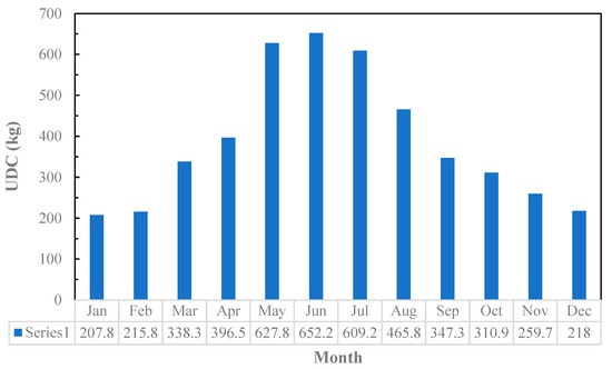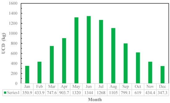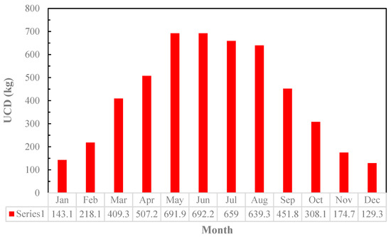 Figure 5 illustrates the monthly reduction in CO2 emissions achieved through the utilization of a rooftop PV system. The maximum reduction occurs in June, reaching 692.2 kg of CO2, whereas the lowest recorded value is approximately 129.3 kg in December. This reduction was calculated based on the avoided emissions from conventional thermal power plants, typically producing 0.58 kg of CO2 per kWh. The UCD values directly correspond to PV energy generation trends, reaffirming the environmental benefits of solar power in mitigating greenhouse gas emissions. As a result, in the warm months of the year when energy production is higher, such as June, May, and July, the reduction in carbon dioxide emissions is also the greatest, but in the cold months of the year, such as December, January, and November, when energy production is low, the reduction in carbon dioxide is also the least. For this reason, the carbon dioxide reduction in June was 5.35-times greater than in December.