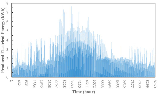 Figure 6 presents the hourly energy generation profile of the BIPV system over a typical day. The energy output follows a gradual increase in the morning, peaks around midday, and decreases toward the evening, aligning with solar irradiance patterns. Unlike the rooftop system, the BIPV system produces higher electrical energy in the morning and afternoon because the radiation is inclined and the BIPV system is installed vertically. In the maximum state, the electrical energy produced was 7.65 kWh. Even though the power output was higher than the rooftop system at certain times, the rooftop system produced more energy overall. Additionally, the energy production of this system is different in summer and winter compared to the rooftop system. In summer, the rooftop system produces more power, while in the BIPV system, the energy production is higher in winter due to oblique radiation. The photovoltaic system had a large difference in the amount of electrical energy produced in the summer months compared to the cold months of the year, but in the BIPV system, this difference was reduced; however, the energy produced was still higher in the warmer months of the year, which is explained below. For example, on 15 January at 1:00 PM the amount of energy produced was 1.47 kWh, but on 15 August at 1:00 PM, the amount of energy produced was 4.00 kWh.