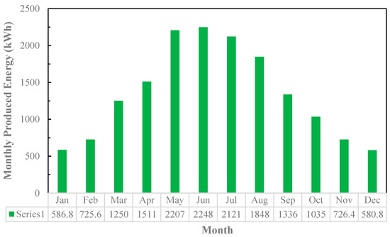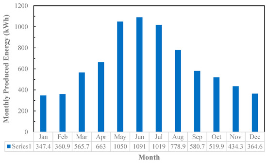 Figure 7 shows the monthly energy production of the BIPV system across an entire year. The highest energy production occurred in June, reaching approximately 1090.6 kWh, while the lowest production was recorded in January, with only 347.4 kWh. The variation in output followed the expected seasonal changes in solar irradiance, with longer summer days contributing to greater BIPV output and shorter winter days leading to decreased energy generation. Unlike rooftop PV, BIPV panels are more susceptible to variations in orientation and shading, leading to a less significant seasonal fluctuation. While rooftop PV systems typically demonstrate a sharp drop in efficiency during winter months, BIPV systems, particularly vertically integrated panels, can still capture a reasonable amount of diffuse sunlight, making them relatively more stable in terms of production. However, their overall efficiency remains lower than optimally tilted rooftop PV panels. As a result, these systems produce more energy in winter compared to PV systems, but in summer, these systems produce less power due to more vertical solar radiation.