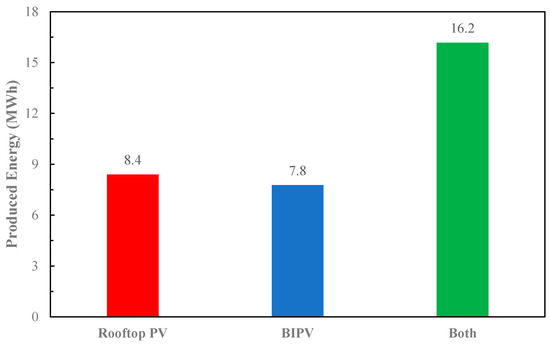The following is a comparison of the three scenarios studied. Figure 12 provides a comparative analysis of the total energy output from rooftop PV, BIPV, and the combination of both systems over a year, revealing that the hybrid system generated the most electricity with an annual total of 16.2 MWh, compared to 8.4 MWh for standalone rooftop PV and 7.8 MWh for standalone BIPV. This superior performance is due to the complementary nature of the two systems; rooftop PV panels, typically installed at an optimal tilt angle, maximize energy capture during peak sunlight hours when the sun is directly overhead, while BIPV systems, integrated into building facades or windows, utilize vertical surfaces to capture diffuse and reflected sunlight during early morning, late afternoon, and even on cloudy days, when rooftop panels are less effective. Additionally, the hybrid system addresses space constraints in urban environments by making use of both horizontal (rooftop) and vertical (BIPV) surfaces, allowing for greater flexibility in energy planning without requiring additional land. The findings emphasize the importance of holistic urban energy planning, where integrated solutions like the hybrid system can maximize renewable energy generation while overcoming architectural and spatial limitations, ultimately contributing to more sustainable and efficient energy systems in cities.