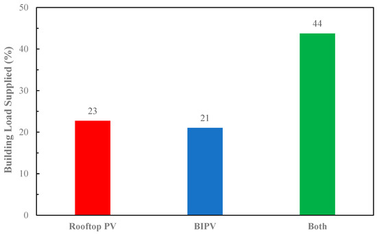 Figure 13 illustrates the percentage of a building’s energy demand met by the different systems, showing that, while rooftop PV and BIPV independently contribute to meeting building loads (22.7% and 21%, respectively), the combination of both provides the highest coverage at 43.7%. This enhanced self-sufficiency is achieved by leveraging the complementary energy generation patterns of rooftop PV, which excels during peak sunlight hours, and BIPV, which captures energy from vertical surfaces during non-peak periods. Furthermore, integrating energy storage solutions with these PV systems can significantly increase resilience by storing excess energy for use during low-generation periods, thereby reducing dependency on the grid and advancing toward a more sustainable and reliable energy supply.
