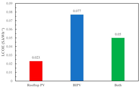 Figure 14 compares the LCOE for rooftop PV, BIPV, and the combined system, revealing that the rooftop PV system achieved the lowest LCOE at USD 0.023/kWh, while BIPV had a higher LCOE of USD 0.077/kWh due to installation complexities and lower energy production caused by less optimal sunlight exposure on vertical surfaces. The hybrid system, with an LCOE of USD 0.05/kWh, struck a balance between cost and energy output, making it an attractive option despite its higher cost compared to standalone rooftop PV. This is because the hybrid system maximizes energy production by combining the strengths of both rooftop and BIPV systems, offering a more efficient use of available space. Lower LCOE values improve the financial feasibility of PV adoption in residential and commercial buildings, and with incentives, subsidies, and technological advancements, these costs can be further reduced, driving higher adoption rates and accelerating the transition to renewable energy.