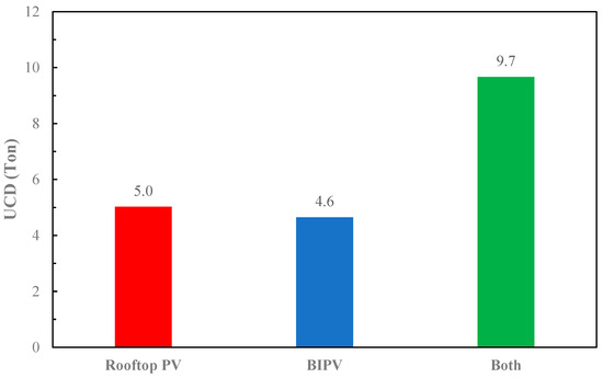 Figure 8 quantifies the monthly reduction in CO2 emissions achieved through the BIPV system. The maximum recorded UCD occurred in June, reaching 652.2 kg of CO2, while the lowest reduction was observed in January at 207.8 kg of CO2. The overall trend closely mirrors the monthly energy generation pattern of Figure 7, indicating a direct relationship between solar energy production and carbon emission reduction. However, while the BIPV system significantly reduced CO2 emissions, its overall impact was still less than rooftop PV, as observed in previous figures. This is due to lower energy production efficiency. To maximize CO2 savings, a hybrid system combining BIPV with rooftop PV and energy storage would be a more effective approach. As a result, in the warm months of the year when energy production is higher, such as June, May, and July, the reduction in carbon dioxide emissions was also the greatest, but in the cold months of the year, such as January, February, and December when energy production is low, the reduction in carbon dioxide was also the least. For this reason, the carbon dioxide reduction in June was 3.14-times greater than in January.