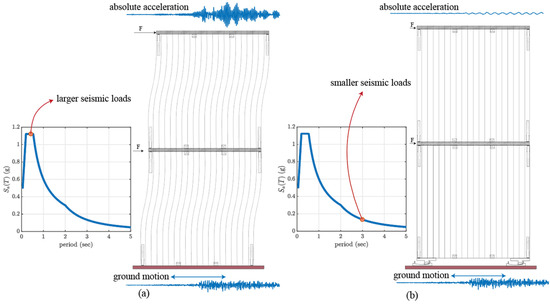 Effects of seismic isolation: (a) fixed-base CLT building; (b) CLT building equipped with frictional isolators.