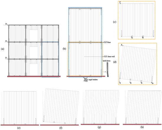 A seismic lateral resistance system can be realized by connecting panels of CLT employing steel connectors, namely angle brackets and hold-downs, as shown in Figure 2b. When a structure is subjected to a ground motion, lateral forces are transmitted to the building. If the structure is fixed to the ground, these lateral forces can be idealized as increasing concentrated loads acting on the diaphragms (i.e., CLT floors) of the building, as shown in Figure 2a.