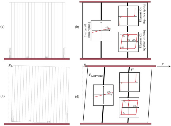 Representation of Smooth Hysteretic Model (SHM): (a) CLT shear wall in nondisplaced configuration; (b) SHM in nondisplaced configuration; (c) CLT shear wall in displaced configuration; (d) SHM in displaced configuration.