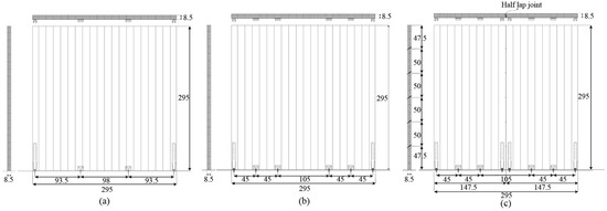 Tested CLT walls: (a) Test-01; (b) Test-02; (c) Test-03. Modified from [6].