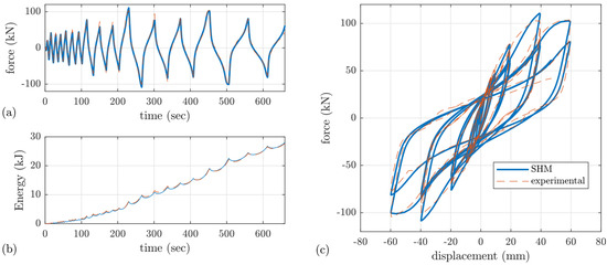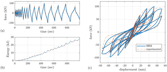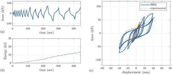 In Figure 5, Figure 6 and Figure 7, a comparison between the experimental responses and the results obtained using the SHM is presented. On these figures, subfigure (a) shows the evolution of the forces generated on the CLT wall, subfigure (b) depicts the cumulative energy dissipated during the tests, and subfigure (c) presents the hysteretic force–displacement relationship. A good agreement between the numerical and experimental responses is observed in the three analyzed cases.
