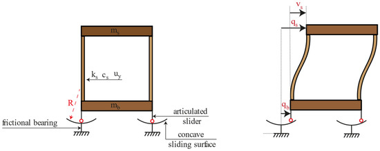 The FPS bearing uses its geometry and gravity to achieve conventional seismic isolation: flexible lateral behavior and a stiff vertical response. In Figure 8b, the forces generated in the device are shown when a lateral force and a vertical force , representing the weight of the superstructure, are acting on the bearing. The external forces and are equilibrated by a reaction force In this subsection, we analyze the lateral projection of this reaction force. If small displacements are assumed (i.e., small values of the angle ), the lateral projection of the reaction force can be split into two components: the pendular force and the friction force . The pendular force depends on the vertical load applied on the bearing and the lateral displacement of the articulated slider as follows: