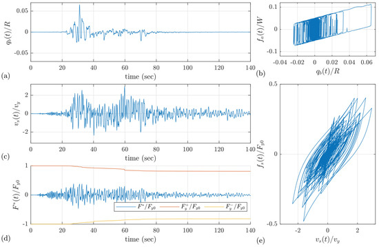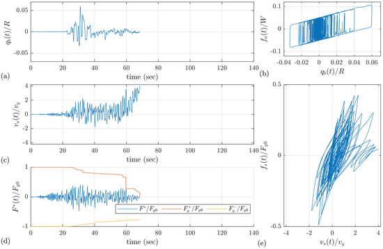 In Figure 8c–e, the normalized force–displacement relationship is presented in terms of normalized pendular force , normalized friction force , and normalized total force .