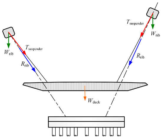 • Complicated mechanical characteristics of the suspender. The suspenders need to be spatially arranged to provide enough constraints to avoid the buckling of outward-inclined arch ribs. Since the vertical component is certain, the force of suspenders is closely related to the inclination angle of arch ribs, and all the equilibrium relationships (such as the out-of-plane equilibrium of the arch) differ from conventional ones (Figure 3).