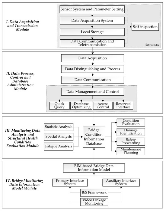 According to the structural features of the Fu River Bridge, the structural health monitoring system is designed to include four primary modules, and the integrated design architecture of the BIM-based SHM system in the Fu River Bridge is depicted in Figure 8.
