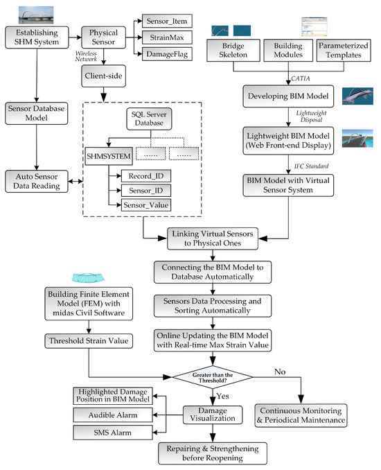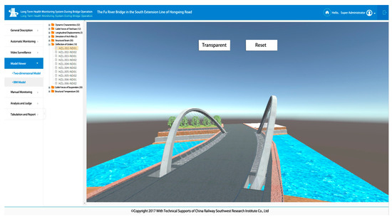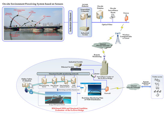 The above SHM system is designed to focus on the bridge deflection, stress condition of key cross-sections in the arch rib and main girder, the vibration acceleration of the arch rib, the cable force variation of suspenders and tied-bars, structural temperature, and traffic loads. The monitoring data from each sensor are acquired and stored on the on-site acquisition PC, transmitted to the surveillance center by use of the wireless communication and remote monitoring techniques. The supervisor PC then retrieves, processes, displays and analyzes these data, and provides the real-time safety evaluation for the bridge operation. The integral design architecture of the BIM-based SHM system for the Fu River Bridge is shown in Figure 8, and the flowchart of BIM-based SHM and structural monitoring and evaluation system is shown in Figure 9.