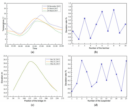Considering the complex structural features, bridge deck deflection, forces of tied-bars and suspenders, and the arch rib deformation are adopted as the evaluation indexes to reflect structural conditions under dead loads. The statistical comparative diagnosis method based on static identifications is used to analyze the measured value and the deviation, which could manifest the performance evolution of bridge structural components. In order to eliminate the interference of environment temperature and vehicle loading to the utmost extent, the appropriate night time is chosen as the analysis period, which is characterized by a stable temperature field (the temperature difference is within 1.5 °C) and less traffic flow. Meanwhile, statistical fitting formulas are used to eliminate the influence of the temperature dependency on monitoring data. Based on the above considerations, three representative time domains at different service periods are selected to analyze and evaluate the structural conditions under dead loads. Concretely, a period in the initial operation of the BIM-based SHM system (02:00~05:00 a.m., 28 December 2015, set as the initial state), and two periods before (02:00~05:00 a.m., 23 March 2017) and after (02:00~05:00 a.m., 28 March 2017) the actual incident that an overweight/oversize vehicle (with a weight of 80 t) passed over the arch bridge are selected. Through the analysis of mass data obtained from the three representative time domains, some valuable measured curves and deviation curves could be depicted as follows (Figure 16a–d). The definition of “deviation rate” is “(Vmaximum measured value – Vinitial value)/Vinitial value × 100%”, where the “Vmaximum measured value” represents the maximum measured value of the internal forces of suspenders and internal forces of tied-bars under dead loads, selected from the maximum measured value at the three representative time domains at different service periods.
